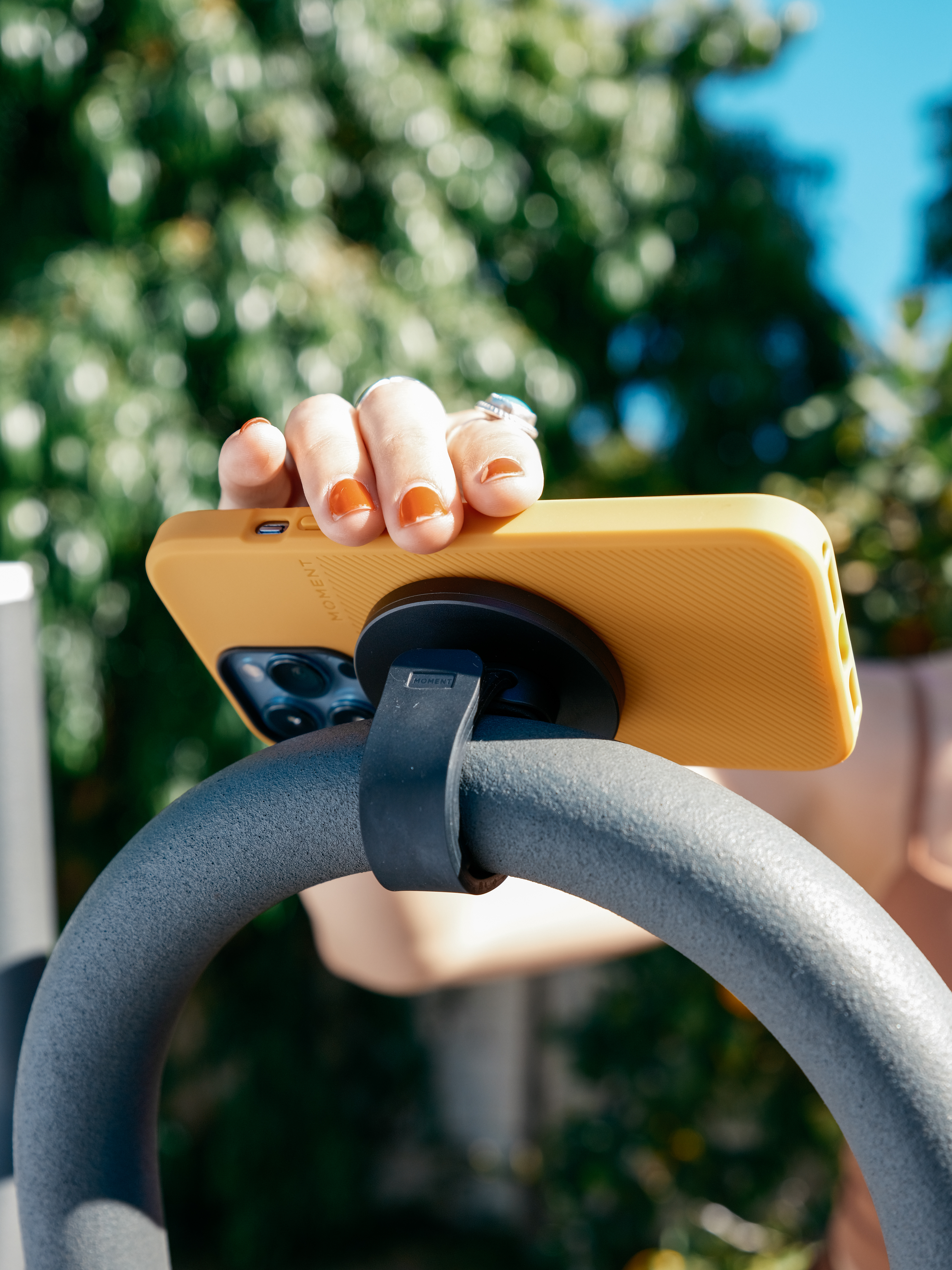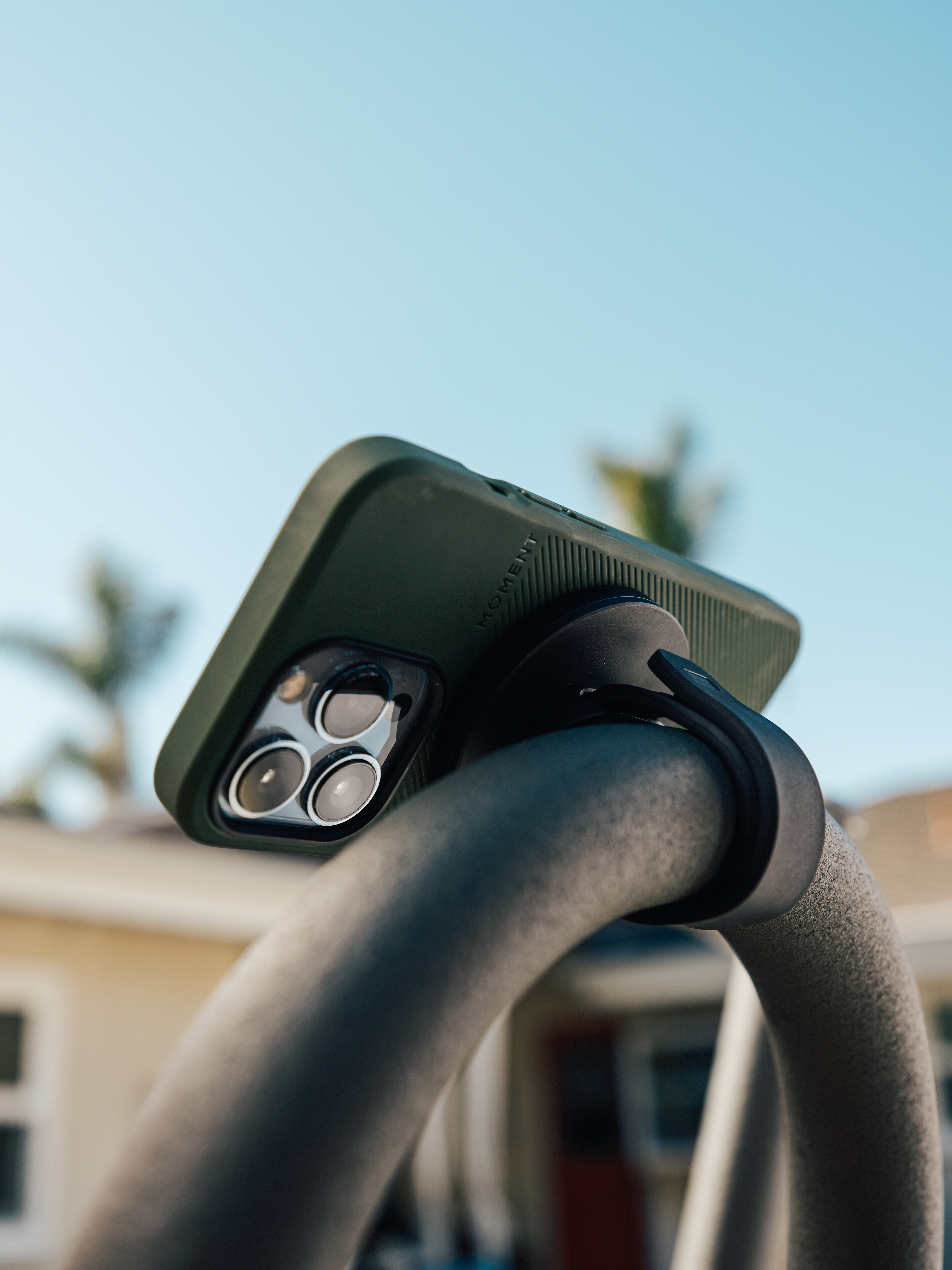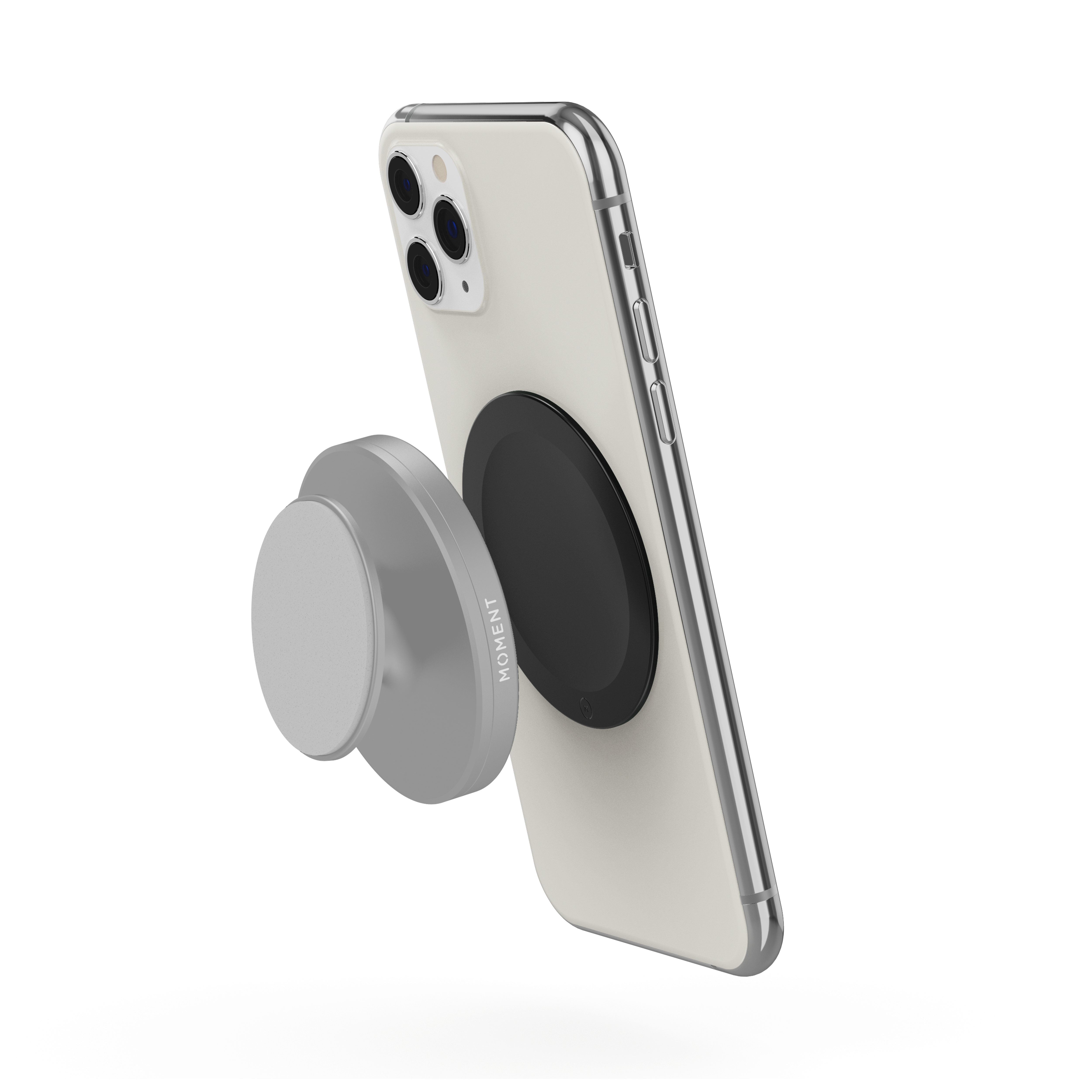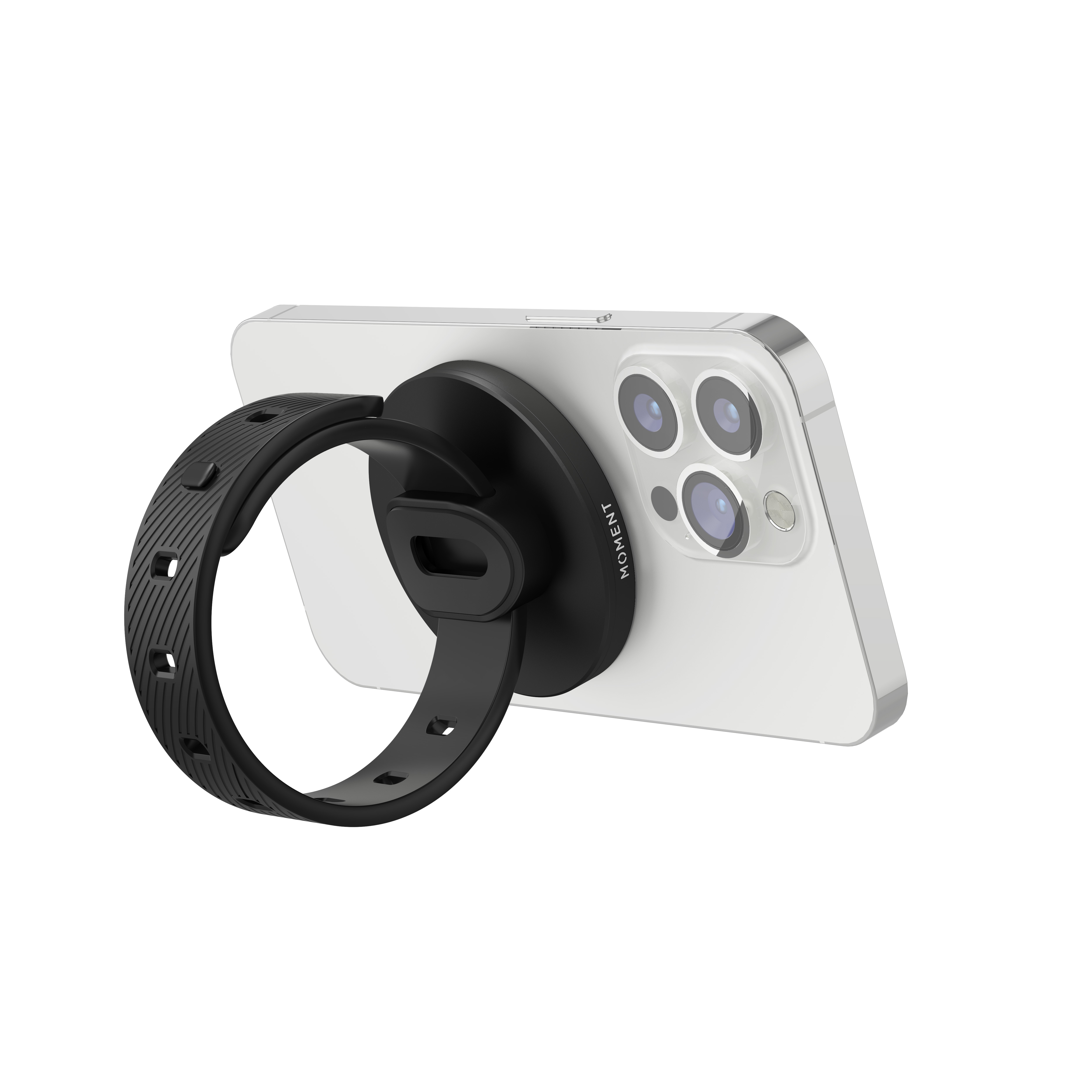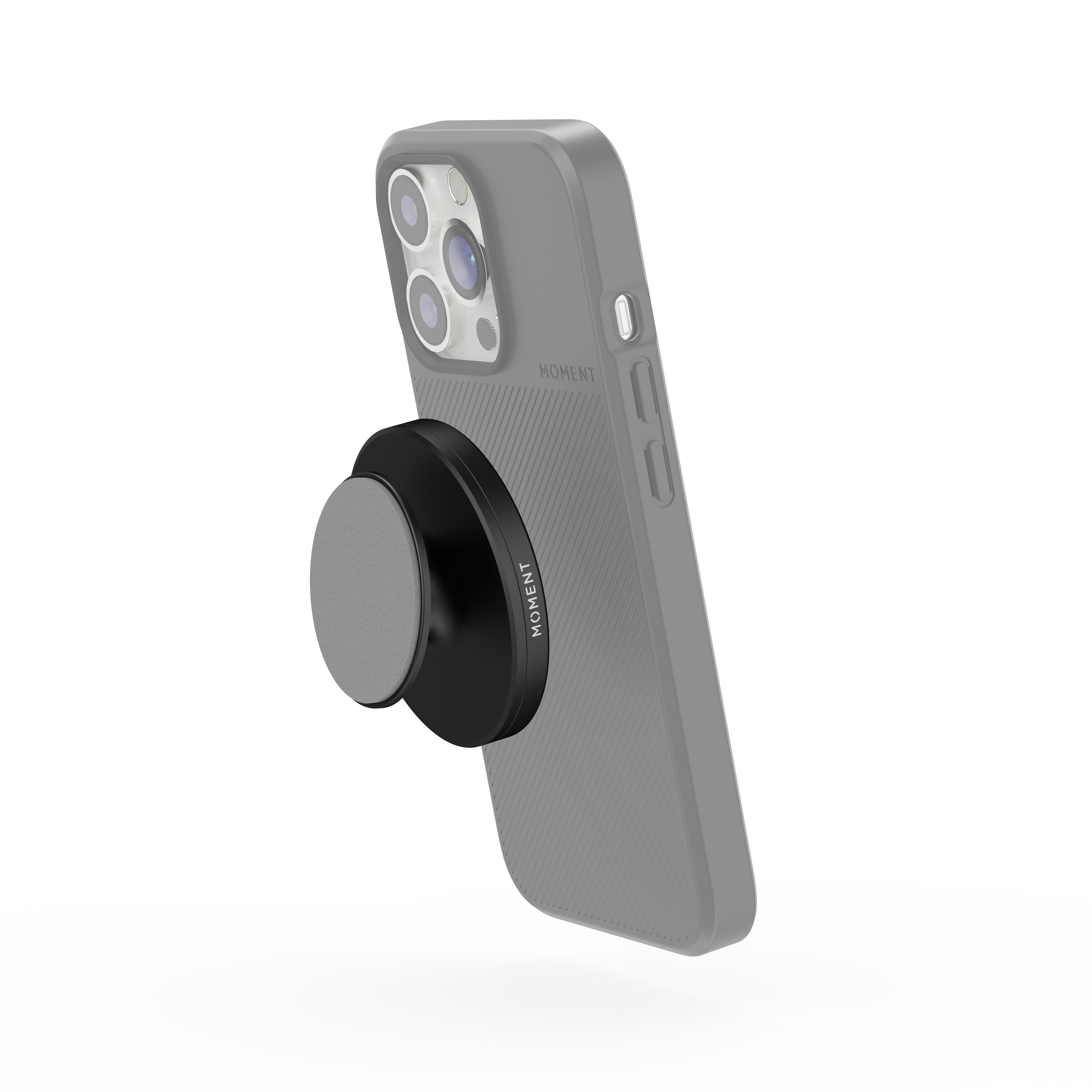 • MagSafe-fähige iPhones können unmittelbar am Magneten angebracht und fixiert werden (nicht MagSafe-fähige Smartphones können mit Hilfe des separaten erhältlichen Stick-On-Adapters von Moment nachträglich mit der Magnetfunktion ausgestattet werden)