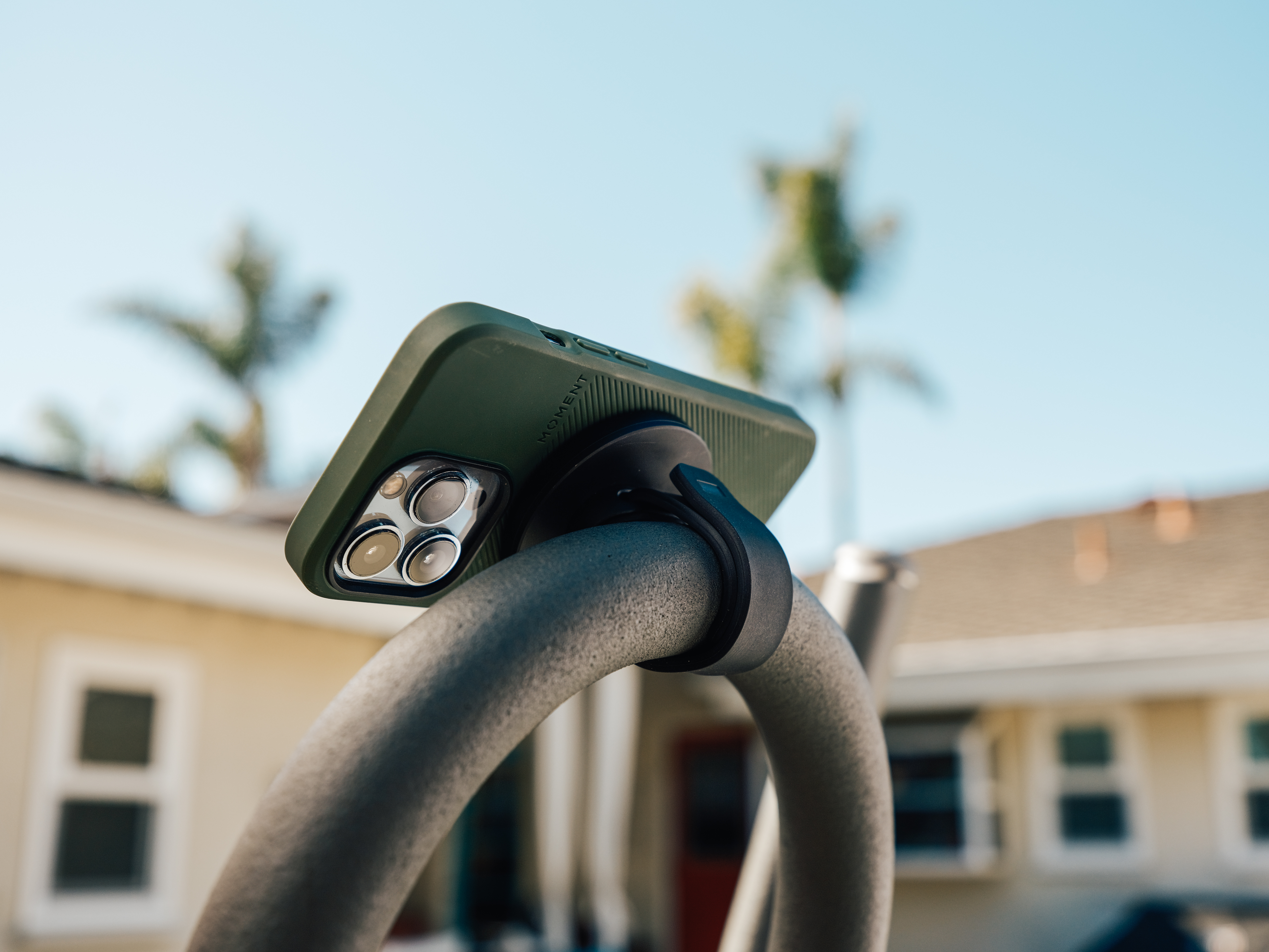 • MagSafe-fähige iPhones können unmittelbar am Magneten angebracht und fixiert werden (nicht MagSafe-fähige Smartphones könne mit Hilfe des separat erhältlichen Stick-On-Adapters von Moment nachträglich mit der Magnetfunktion ausgestattet werden)