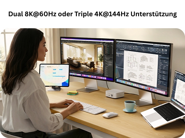 • Ansteuerung von bis zu zwei 8K-Displays mit 60 Hz oder bis zu drei 4K-Displays mit 144 Hz, OS-abhängig