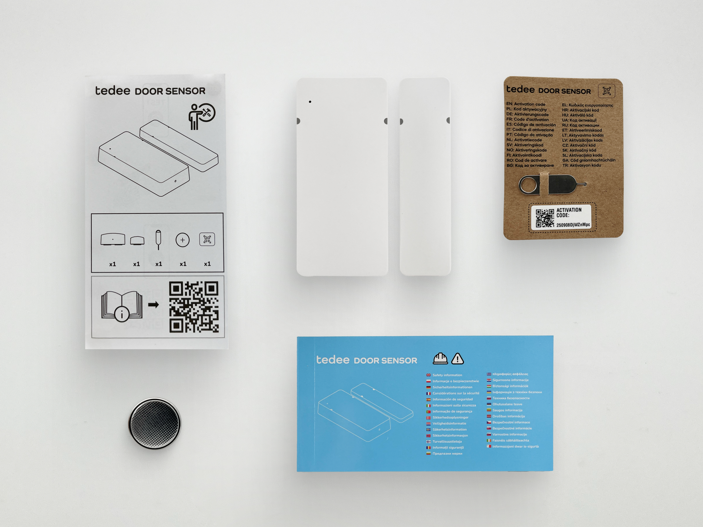 • Lieferumfang: tedee Türsensor (Sensor- und Magnetteil), CR2032-Batterie, Öffnungsstift, vormontierte Klebepads, Bedienungsanleitung